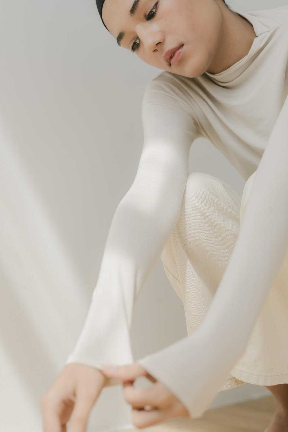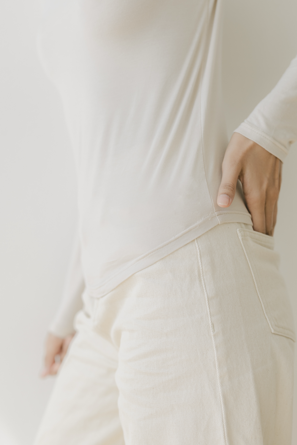 An inner like no other. Mock Neck. Slightly curved hem. Long sleeves. Stretchable.
